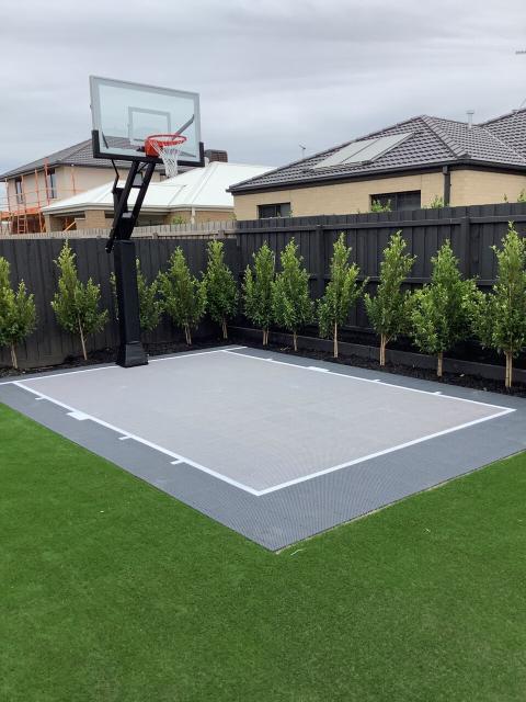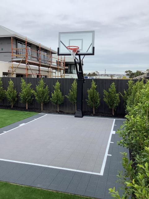 DreamCourts teamed up with Boutique Homes to deliver a stylish compact court installation at their display home in Victoria. Measuring 4.4m x 6.26m, this court features a sleek blend of Graphite Grey and Wind Grey tiles, creating a modern and understated aesthetic that complements the home’s contemporary design.